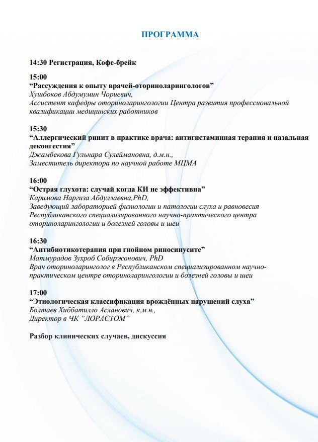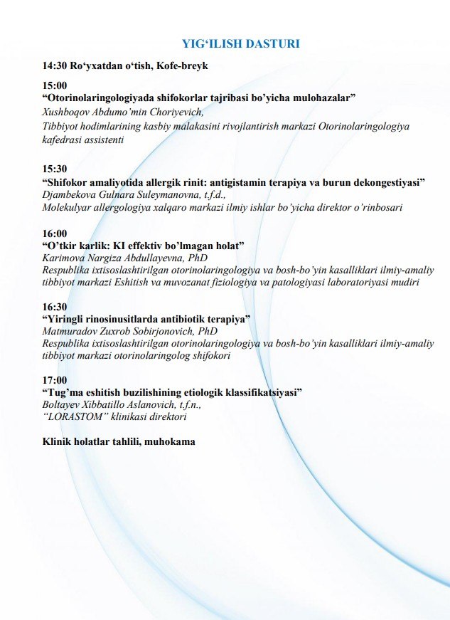 2026 yil 31 martda o‘tkaziladigan O‘zbekiston otorinolaringologiya va bosh-bo‘yin jarrohligi assotsiatsiyasining navbatdagi yig‘ilishiga taklif etamiz.